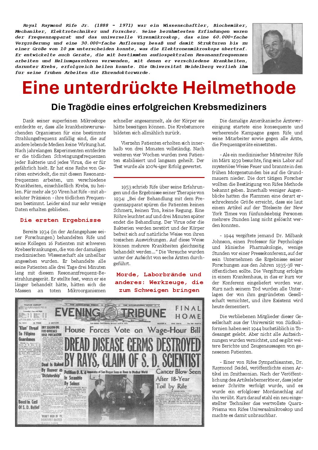 Royal Raymond Rife war ein amerikanischer Wissenschaftler, Ingenieur und Erfinder, der vor allem für seine bahnbrechenden Entwicklungen in der Mikroskopie und der Frequenztherapie bekannt wurde. Seine Arbeiten in den 1920er bis 1940er Jahren legten den Grundstein für alternative Ansätze zur Behandlung von Infektionskrankheiten.